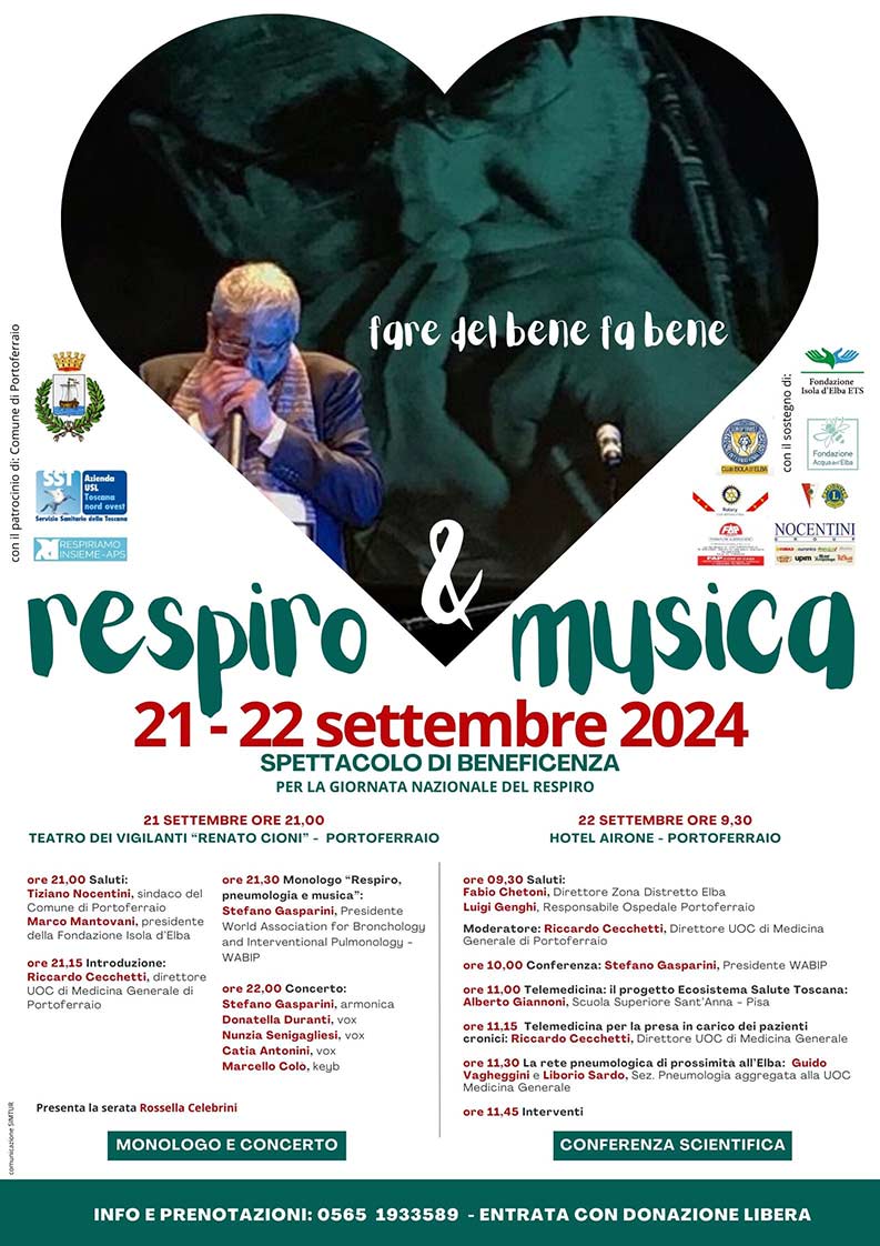 « Faire le bien, c’est bien » : le concert du 21 septembre est une occasion à ne pas manquer pour soutenir généreusement la santé publique de l’Elbe, en participant à une soirée spéciale où harmonie et dialogue scientifique avec toute la communauté. La soirée débutera par les salutations du maire, Tiziano Nocentini, du président de la Fondation, Marco Mantovani et des partenaires de l’initiative. Le Dr Riccardo Cecchetti présentera l’événement. Directeur de l’unité de médecine générale de l’hôpital Portoferraio tandis que Rossella Celebrini présentera la soirée, également en qualité de bénévole comme tous les organisateurs. Les musiciens qui accompagneront le Prof. Gasparini pour le concert « Respiro & Musique »sont Donatella Duranti, Nunzia Senigagliesi, Catia Antonini, Marcello Colò.