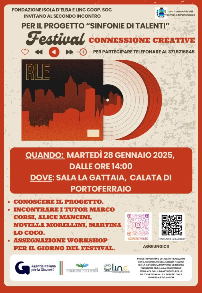 Le mardi 28 janvier 2025, de 14h00 à 15h30, la Sala della Gattaia (via Vittorio Emanuele II, Portoferraio) accueillera le groupe de travail du Festival « Symphonies de jeunes talents », un projet porté par l’Isola d’Fondazione Île d’Elbe, approuvée par résolution du commissaire le 21 août 2024, avec prot. AIG/237 n° 237/2024, par l’Agence italienne pour la jeunesse dans le cadre de l’avis public « NEETwork : connexions créatives. Promouvoir les processus d’activation et d’inclusion des jeunes générations », approuvée par résolution du commissaire du 23 mai 2024, avec protocole. AIG/142-2024.